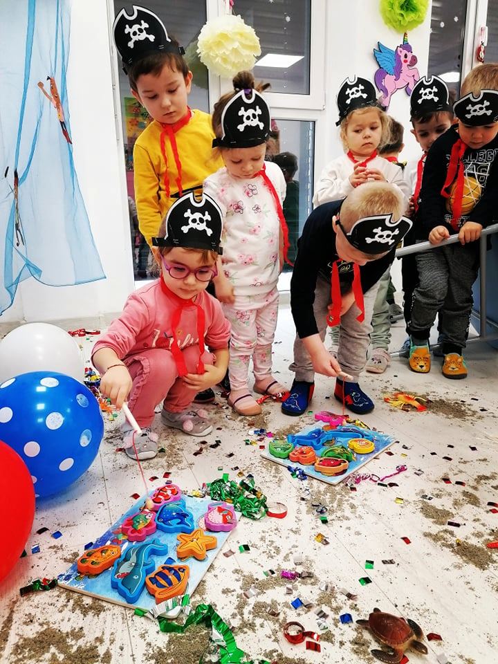Acolo, am desfășurat o adevărată evaluare a proiectului tematic! Printre meduze, scoici, steluțe de mare și delfini, îmbarcați pe o corabie a piraților, ne-am simțit adevărați exploratori ai adâncurilor…