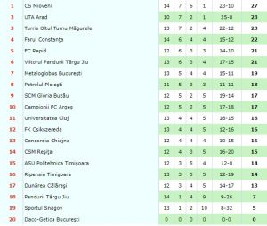 Mai jos aveţi clasamentul la zi, actualizat şi după primul meci al etapei a 15-a, de astăzi, Csikszereda – Turris 1-0: