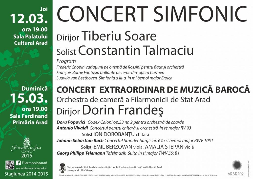 Programat în seara de joi, 12 martie 2015, la ora 19.00, în Sala de Concerte a Palatului Cultural, concertul simfonic dirijat de invitatul orchestrei Filarmonicii, Tiberiu Soare, reia partituri de virtuozitate instrumentală inspirate de “teme – capodopere” ale scenei lirice dar şi un ópus beethovenian, Simfonia a III-a în Mi bemol major Eroica.