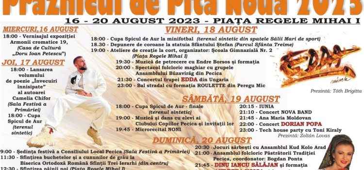 ”Sărbătorim recolta din acest an şi brandul nostru local, Pita de Pecica, cu un program cultural-sportiv variat, cu artişti de renume. Manifestările încep de miercuri, vă invităm, cu drag, să luaţi parte la cât mai multe dintre ele! ” a declarat Petru Antal, primarul orașului Pecica.